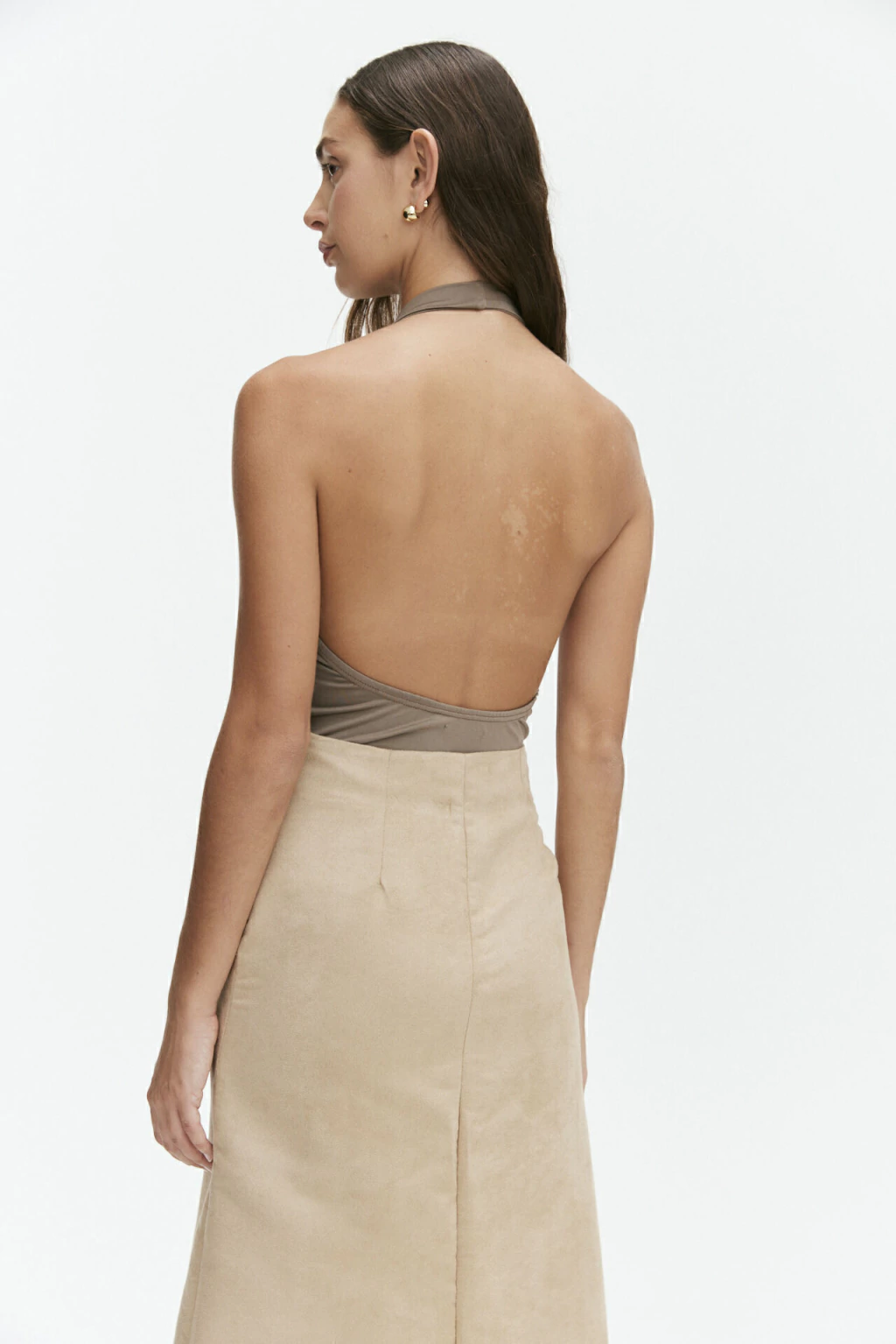 Este top de lycra es la prenda ideal para la mujer moderna que busca un look sofisticado y sensual a la vez. Su diseño con cuello buche y leve caída sobre el delantero le da un toque de elegancia y distinción, mientras que la espalda baja escotada añade un detalle de audacia y femineidad.
