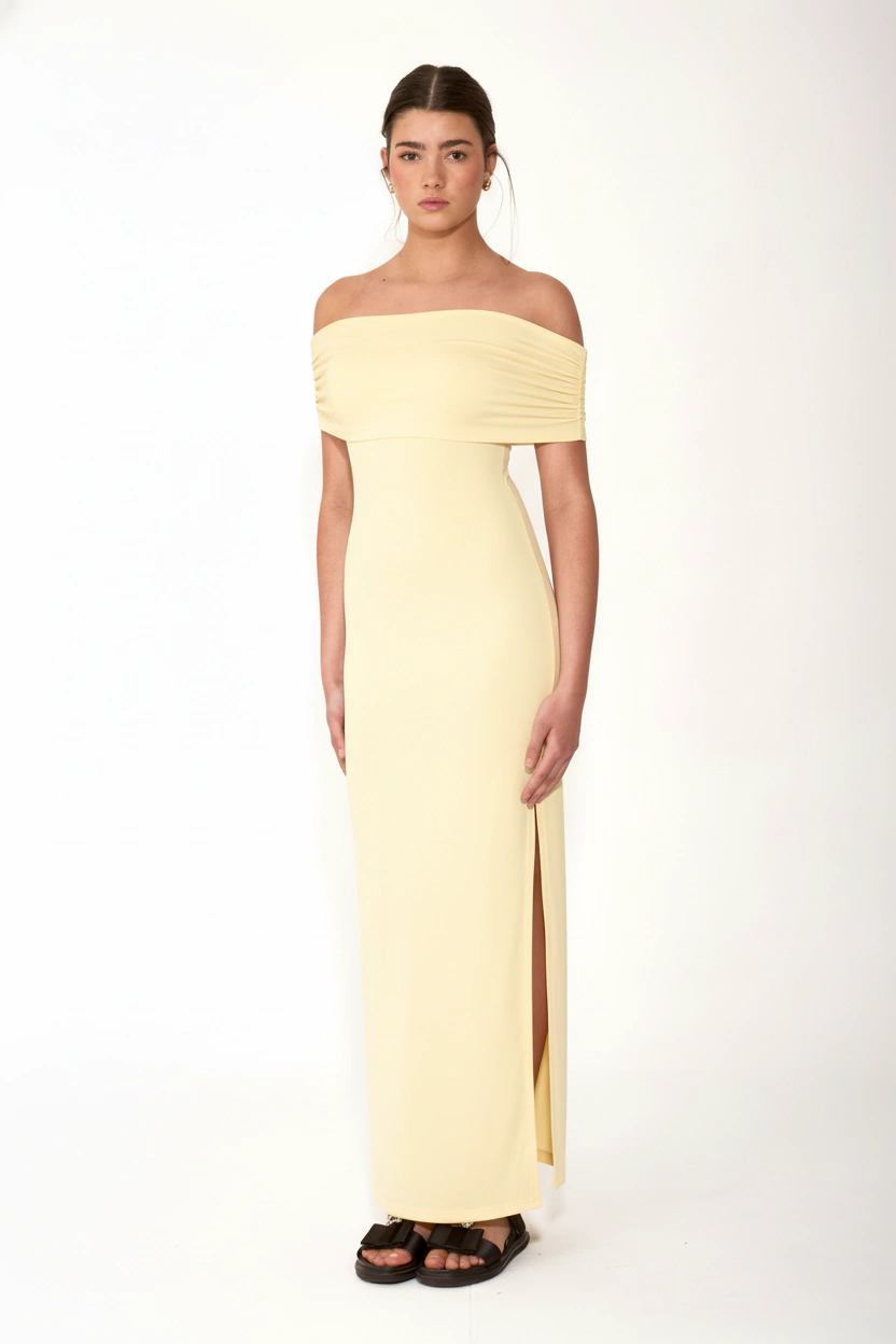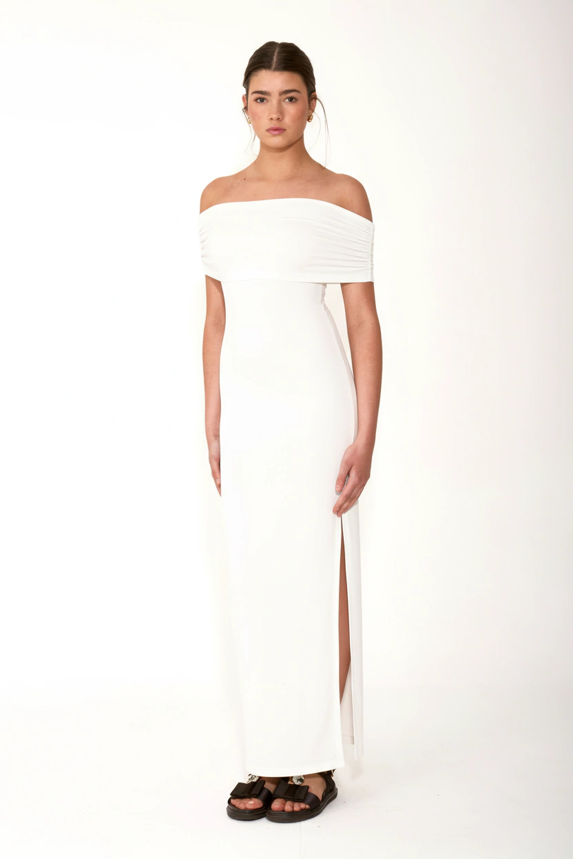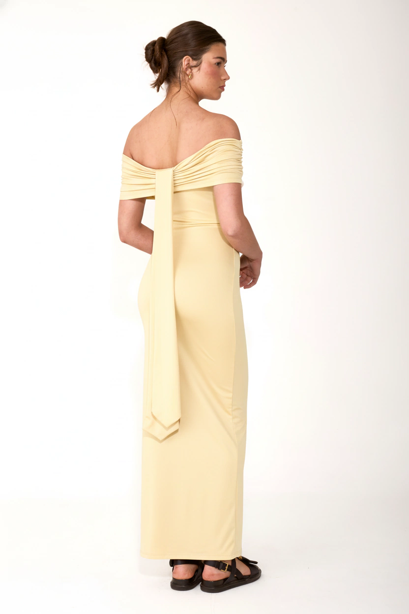 Vestido largo al cuerpo y detalle único. Confeccionado en lycra, off shoulder con con frunce en los laterales, lazo doble en la espalda y tajo lateral.