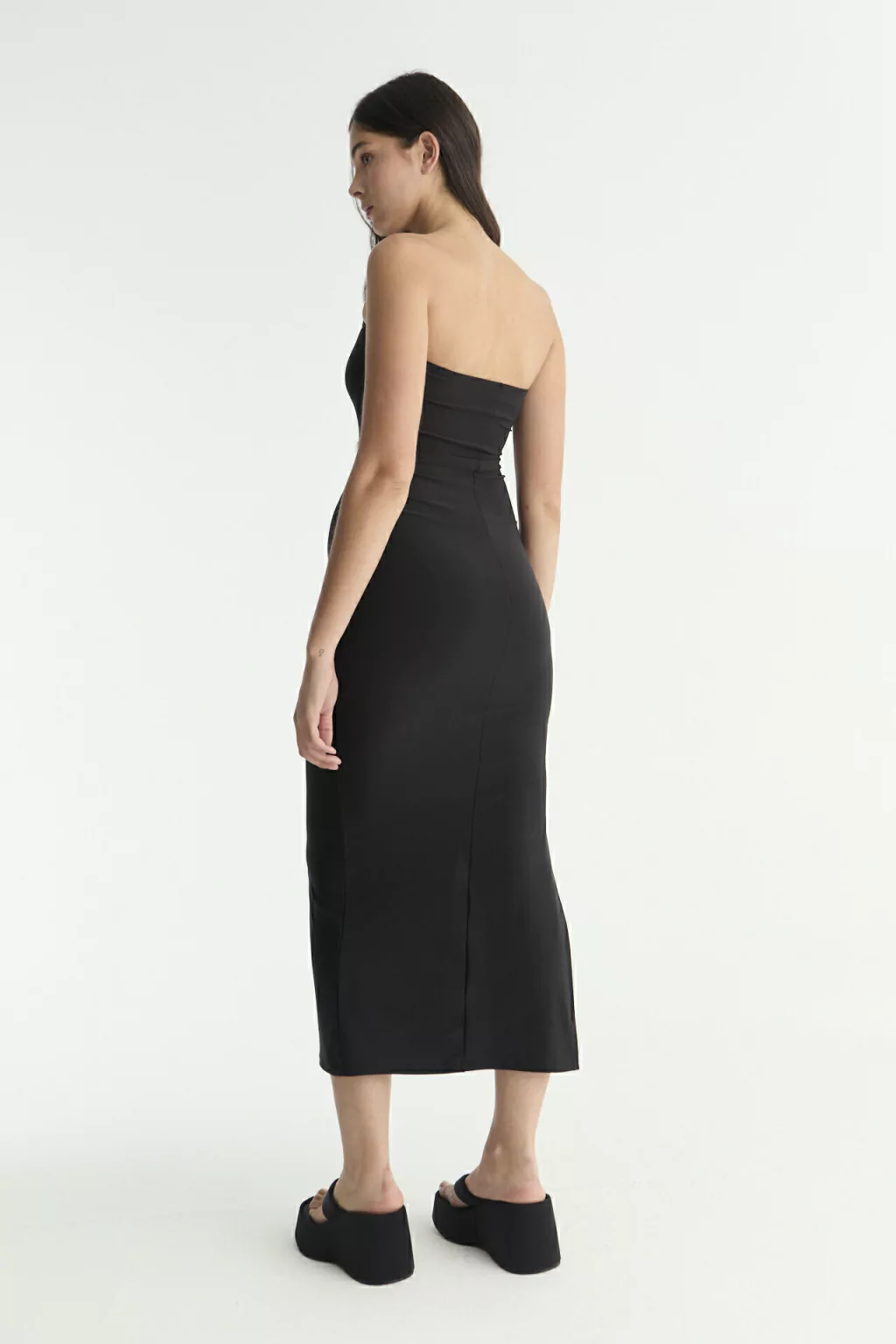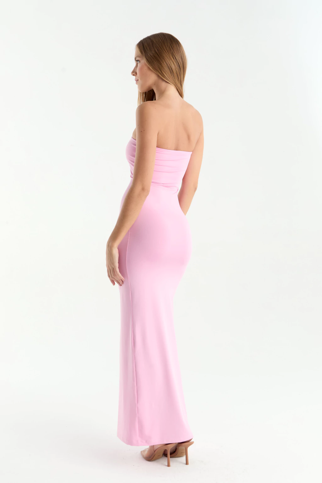 Este vestido largo strapless de lycra es la prenda ideal para quienes buscan un look sofisticado y a la vez sensual. Su diseño sin breteles realza tus hombros y clavícula con elegancia, mientras que el tajo lateral le añade un toque de audacia y movimiento.