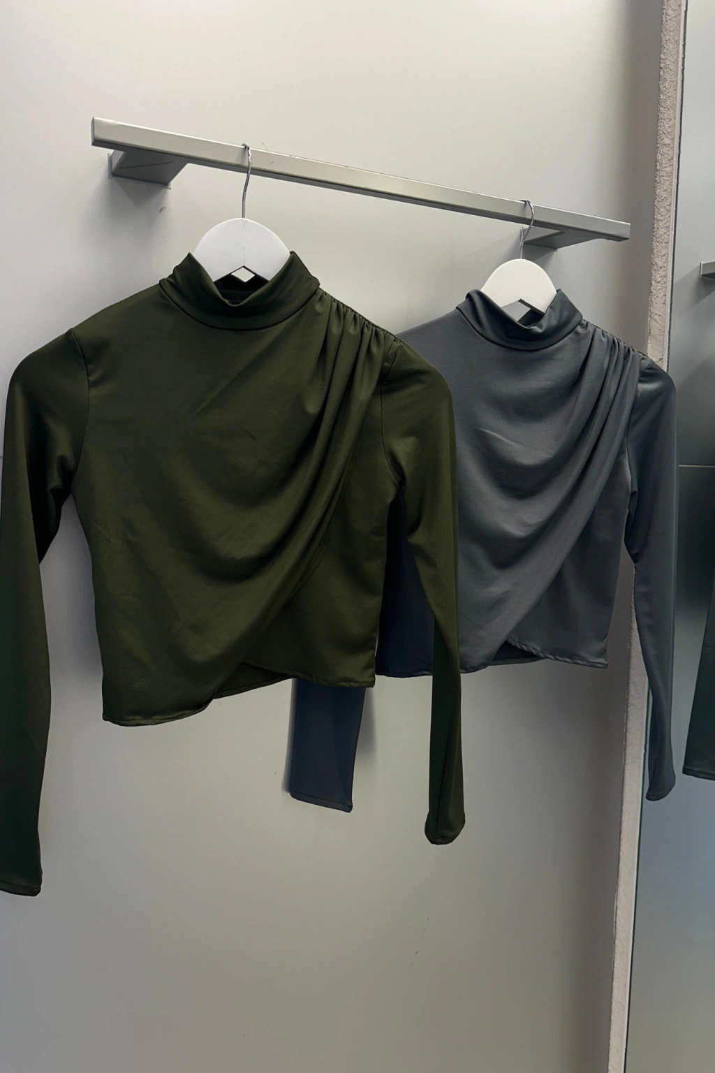 Polera de lycra manga larga con frunces en hombro y ruedo solapado.